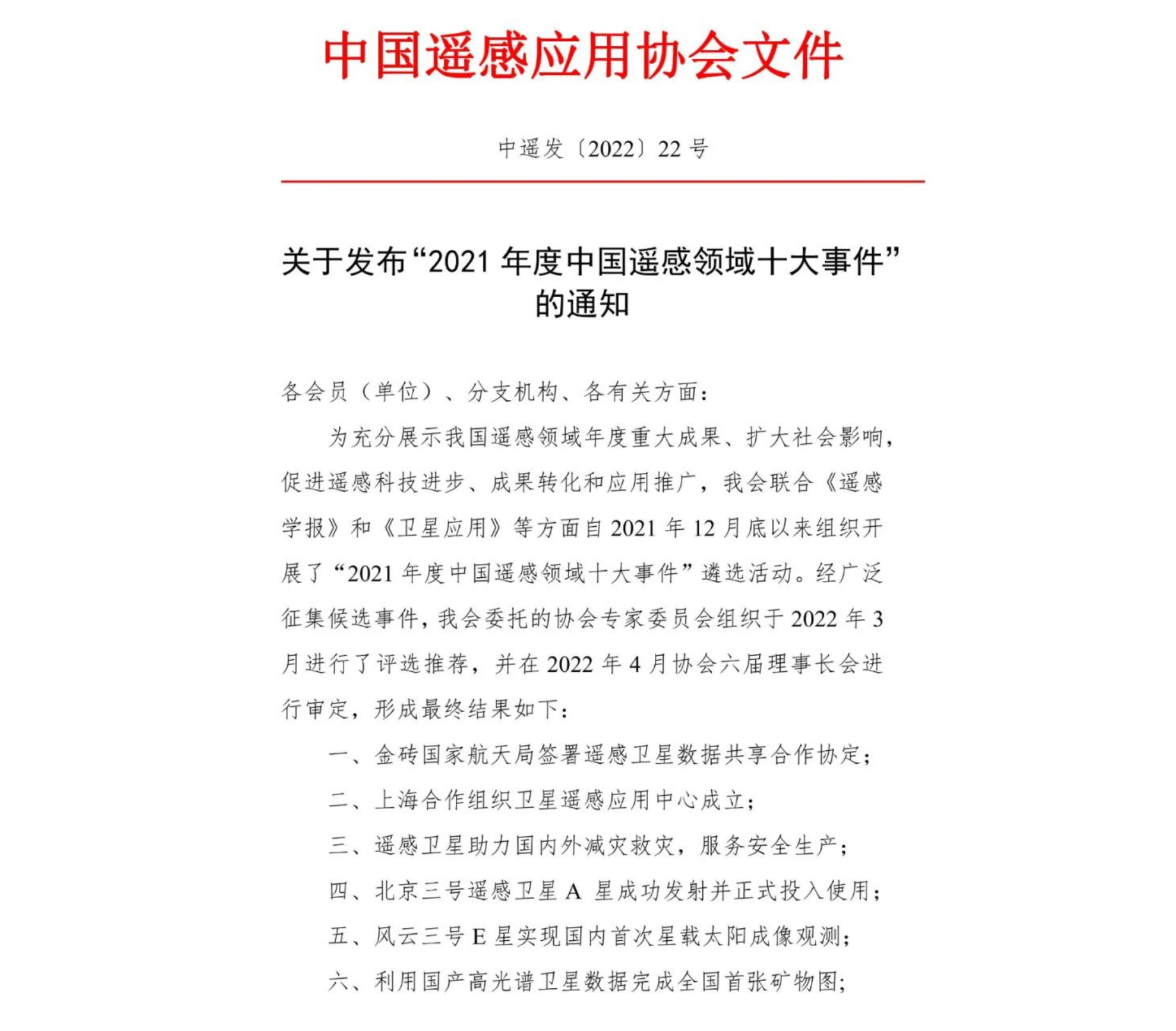 近日,中国遥感应用协会官方发布了“2021 年度中国遥感领域十大事件”,世纪空间联合航天东方红卫星有限公司申报的“北京三号遥感卫星A星成功发射并正式投入使用”成功入选十大事件。